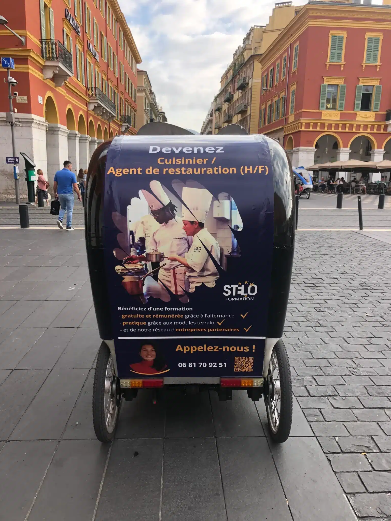 Vous cherchez “vélo publicitaire Nice” parce que vous voulez être vu en centre-ville et dans les zones piétonnes.
